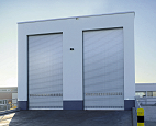 elektro-mechanisch durch Aufsteck- oder Kettenantrieb. Die Steuerung kann über Drucktaster, Schlüsselschalter oder Zugschalter erfolgen, bzw. über Lichtschranken, Induktionsschleifen, Bewegungsmelder oder eine IR- und Funkfernsteuerung, ebenfalls in Verbindung mit einer Ampelanlage. Die Oberflächenausbildung ist verzinkt, einbrennlackiert, kunststoff- oder pulverbeschichtet bzw. eloxiert. Die Struktur ist glatt. Die Elementausbildung ist flächenbündig. Das Tor kann mit einer Schlupftür in einem feststehenden Seitenteil kombiniert werden.